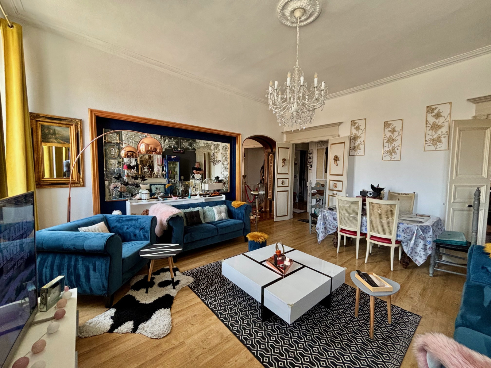 L’appartement principal offre une belle hauteur sous plafond, un parquet chaleureux, du double vitrage, une chaudière récente, et une ambiance élégante mêlant style classique et confort actuel.