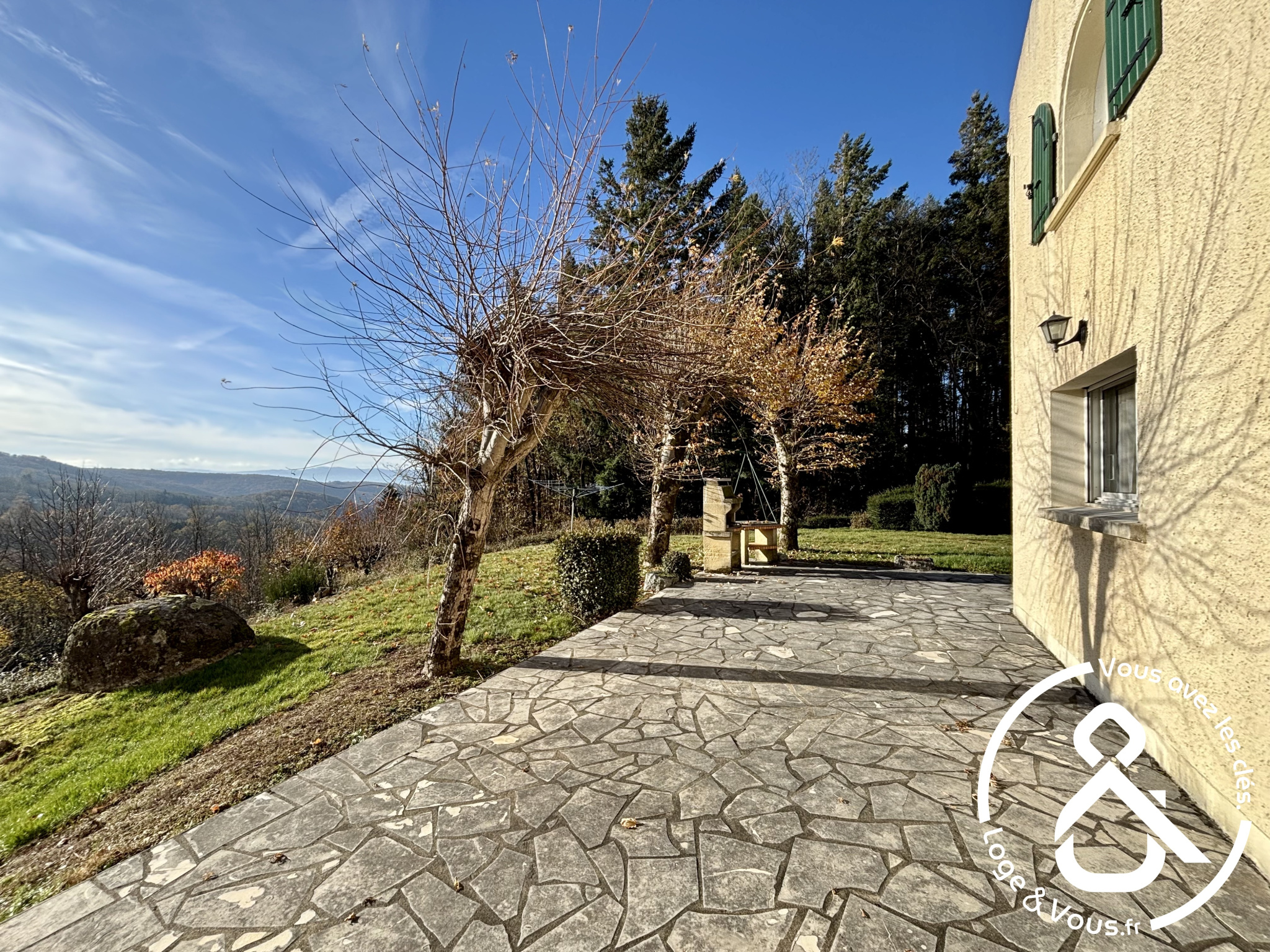 Le tout est implanté sur une magnifique parcelle arborée de plus de 3 300 m², offrant un point de vue exceptionnel sur la campagne environnante, un véritable havre de paix.